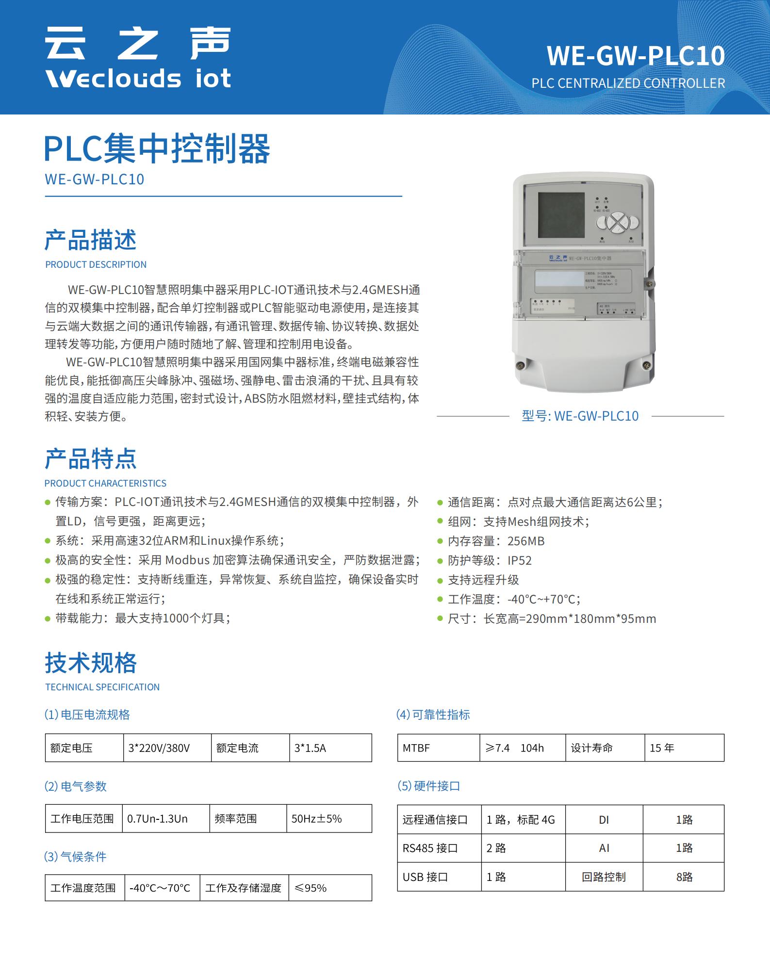 WE-GW-PLC10智慧照明集中器采用PLC-IOT通讯技术与2.4GMESH通信的双模集中控制器,配合单灯控制器或PLC智能驱动电源使用,是连接其与云端大数据之间的通讯传输器,有通讯管理、数据传输、协议转换、数据处理转发等功能,方便用户随时随地了解、管理和控制用电设备。