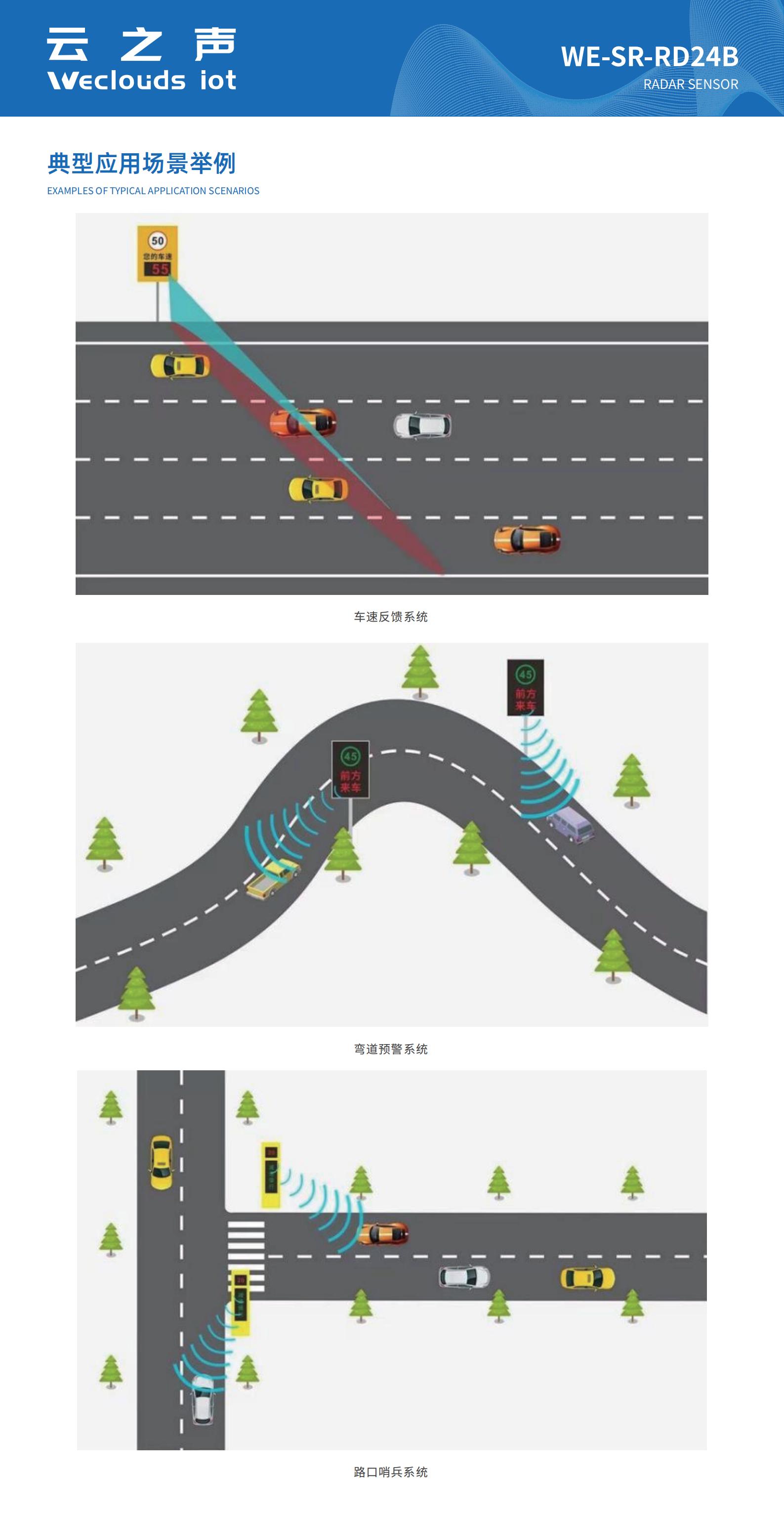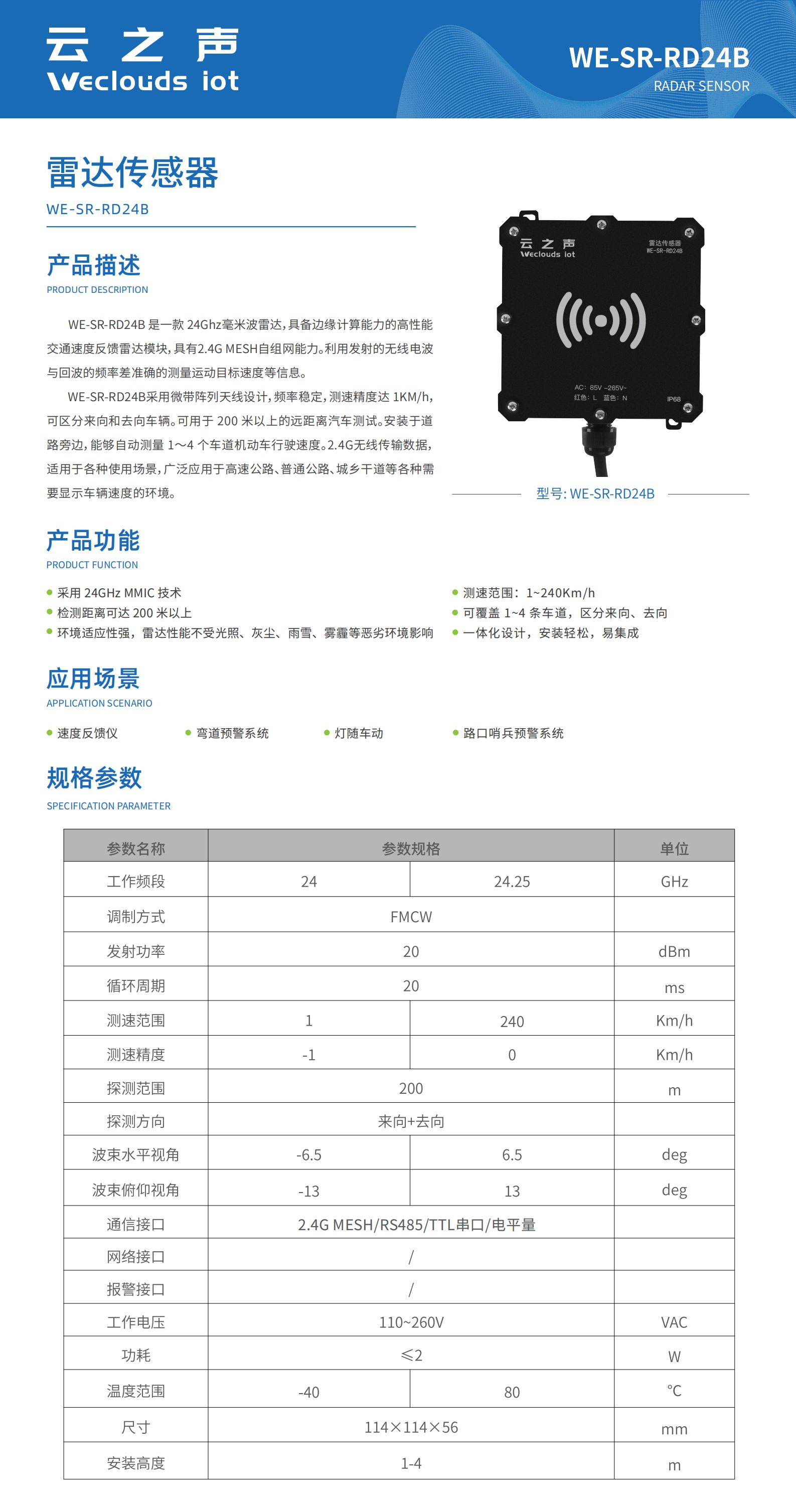 WE-SR-RD24B 是一款 24Ghz毫米波雷达,具备边缘计算能力的高性能交通速度反馈雷达模块,具有2.4G MESH自组网能力。利用发射的无线电波 与回波的频率差准确的测量运动目标速度等信息。