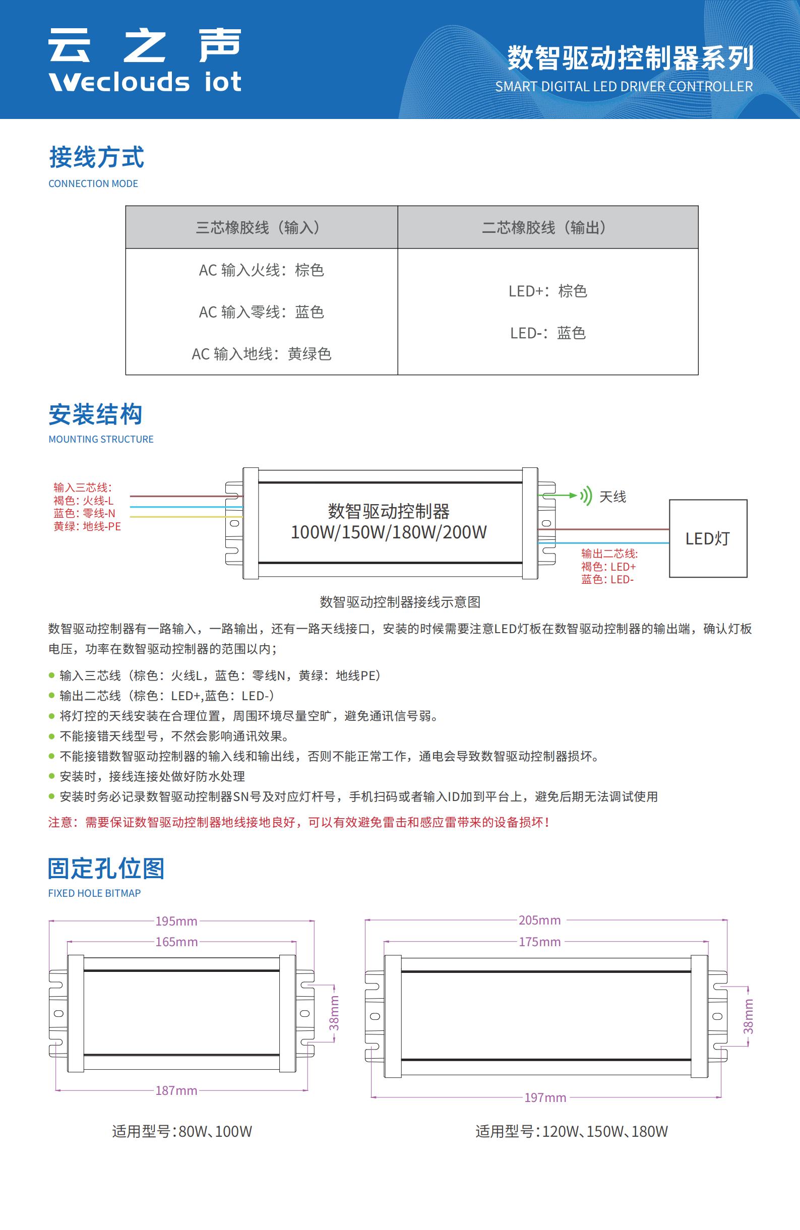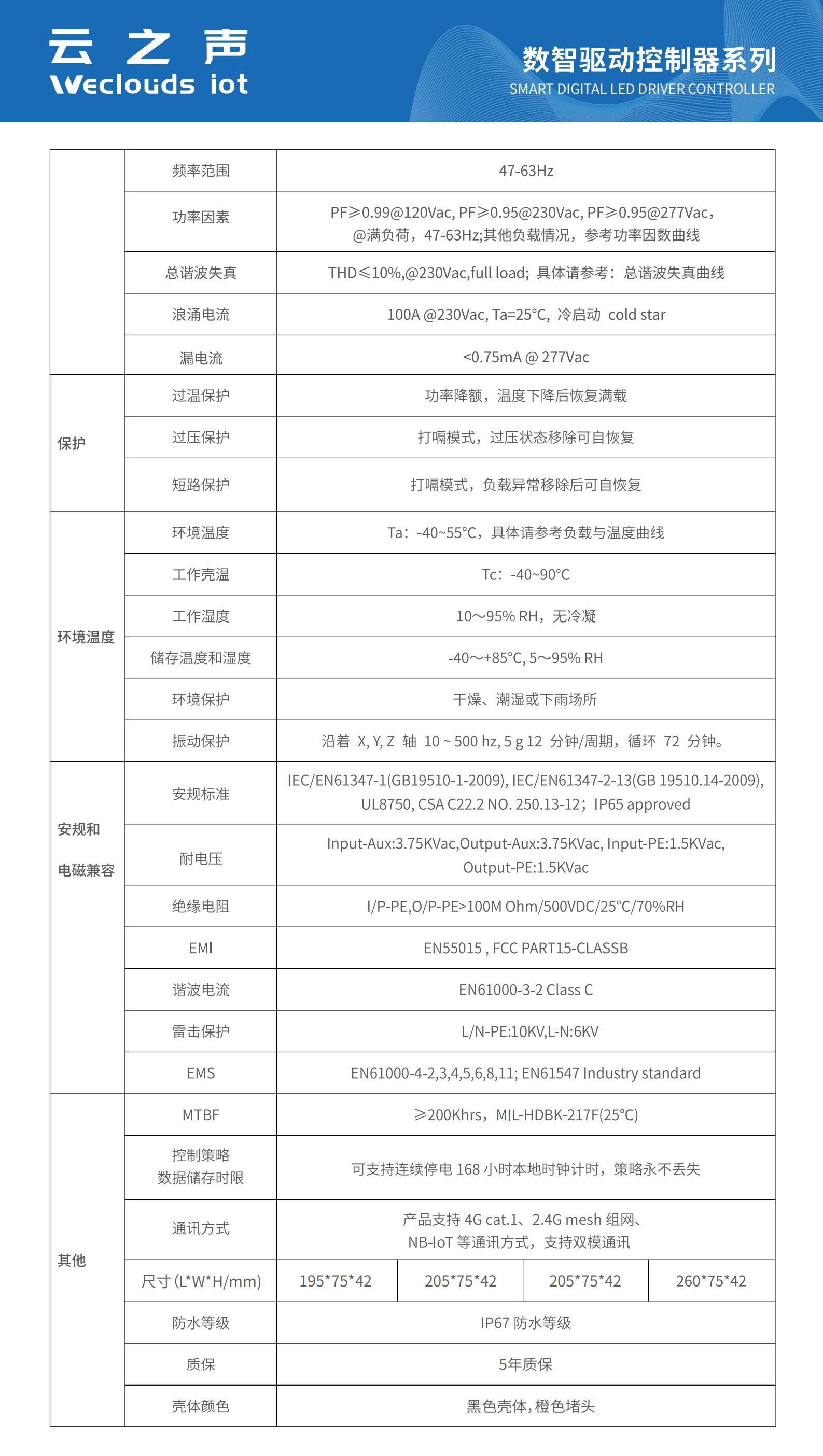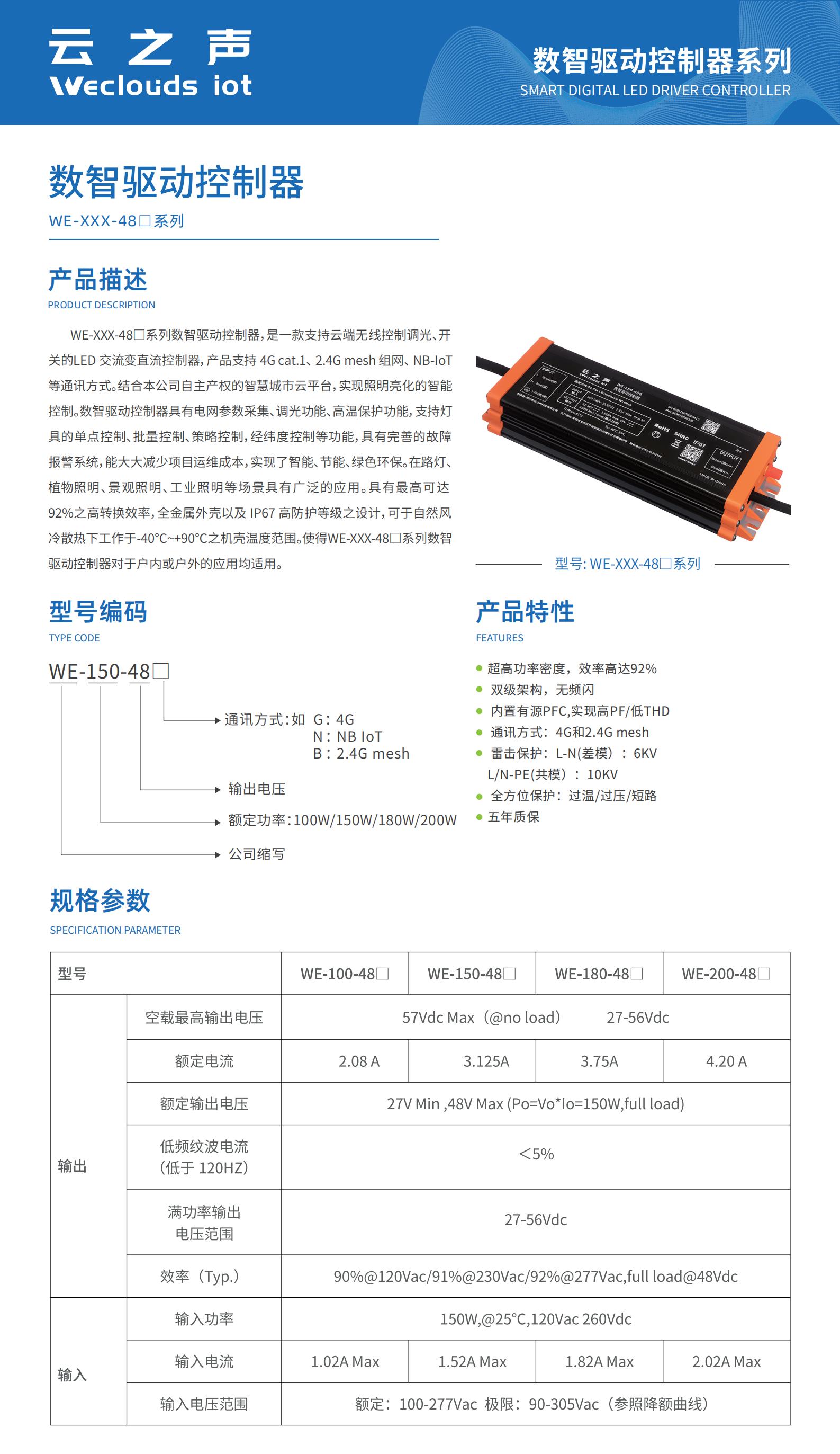 WE-XXX-48□系列数智驱动控制器,是一款支持云端无线控制调光、开关的LED 交流变直流控制器,产品支持 4G cat.1、 2.4G mesh 组网、 NB-IoT 等通讯方式。结合本公司自主产权的智慧城市云平台,实现照明亮化的智能控制。